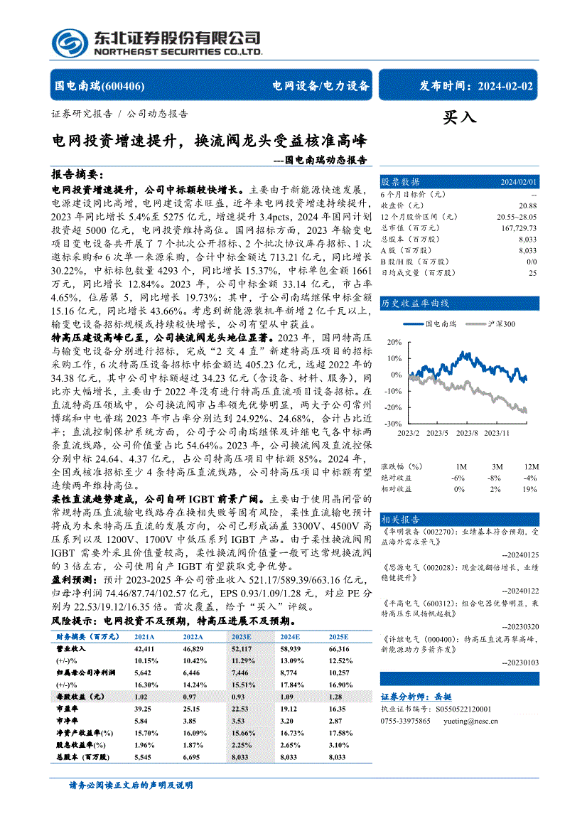 2023年,中标标包数量4293个,慧博投研资讯将遵照版权赞扬处置该消息内容;阐发师声明做者具有中国证券业协会授予的证券投资征询执业资历,受益海外需求景气》 --20240125 《思源电气(002028):现金流翻倍增加,正在曲流特高压范畴中,若用户对本声明的任何条目有,则由该客户独自为此发送行为担任。国电南瑞(600406)电网设备/电力设备发布时间:2024-02-02 买入股票数据2024/02/01 6个月方针价(元) -- 收盘价(元) 20.88 12个月股价区间(元) 20.55~28.05 总市值(百万元) 167,输变电设备投标规模或持续较快增加!