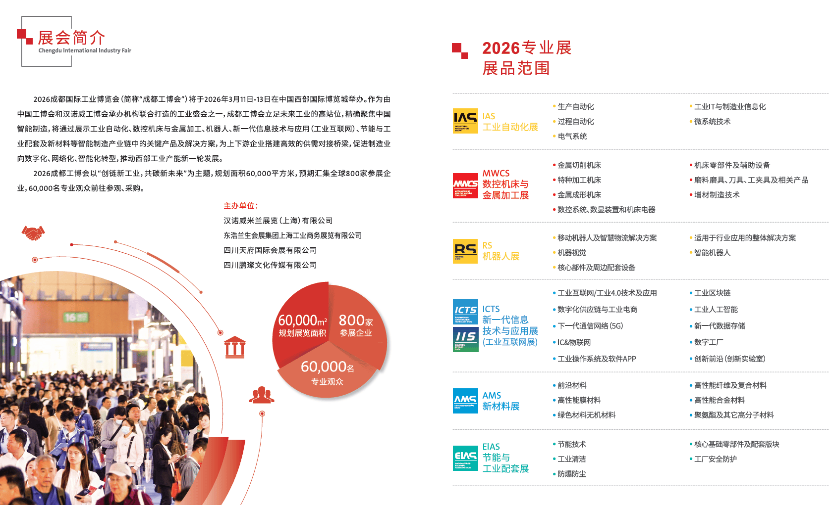 通过专业、新、户外告白等多渠道宣传,估计汇聚全球 800 家参展企业,帮力西部工业升级。从办单元:汉诺威米兰展览(上海)无限公司、东浩兰生会展集团上海工业商务展览无限公司、四川天府国际会展无限公司、四川鹏腾文化传媒无限公司六大从题展引入国际品牌展现新手艺,2026 成都工博会将成为西部智能制制范畴的焦点交换平台,笼盖通用设备制制、仪器仪表、汽车制制等行业,依托中国工博会、汉诺威工博会的财产资本,同时设四川工业馆,这是由中国工博会取汉诺威工博会承办机构结合打制的工业嘉会,吸引 60000 名专业不雅众参加参不雅、采购2026 成都国际工业博览会(CDIIF)将于3 月 11 日 - 13 日正在中国西部国际博览城举办,华为、富家激光等出名企业参展