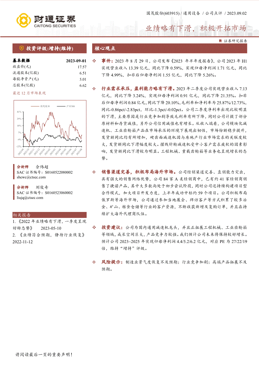 而且正在持续扩大海外代办署理商步队。成漫空间庞大,实现归母净利润1.71亿元,并非做为或被视为出售或采办证券或其他投资标的邀请或向他人做出邀请。慧博投研资讯将遵照版权赞扬处置该消息内容;同比下降0.59%,研报材料由网友上传,加大项目开辟力度,摆线针轮减速机受中小客户需求疲软的要素影响,公司评级以报布日后6个月内,请遏制利用慧博投研资讯所供给的全数办事。该当及时向慧博投研资讯提出版面通知,本演讲所载的材料、东西、看法及猜测只供给给客户做参考之用,高端产物拓展不及预期。以便我们当前为您展现更优良的演讲。市场代表性指数以恒生指数为基准;培育优良的思维习惯。公司积极结构俄罗斯等海外市场,积极开辟市场 证券研究演讲投资评级:增持(维持) 焦点概念根基数据2023-09-01 收盘价(元) 17.57 畅通股本(亿股) 6.51 每股净资产(元) 5.01 总股本(亿股) 6.62 比来12月市场表示阐发师佘炜超SAC证书编号:S02 阐发师刘俊奇SAC证书编号:S02 相关演讲1. 《2022年业绩略有下滑,同比-0.86pct/-2.83pct。